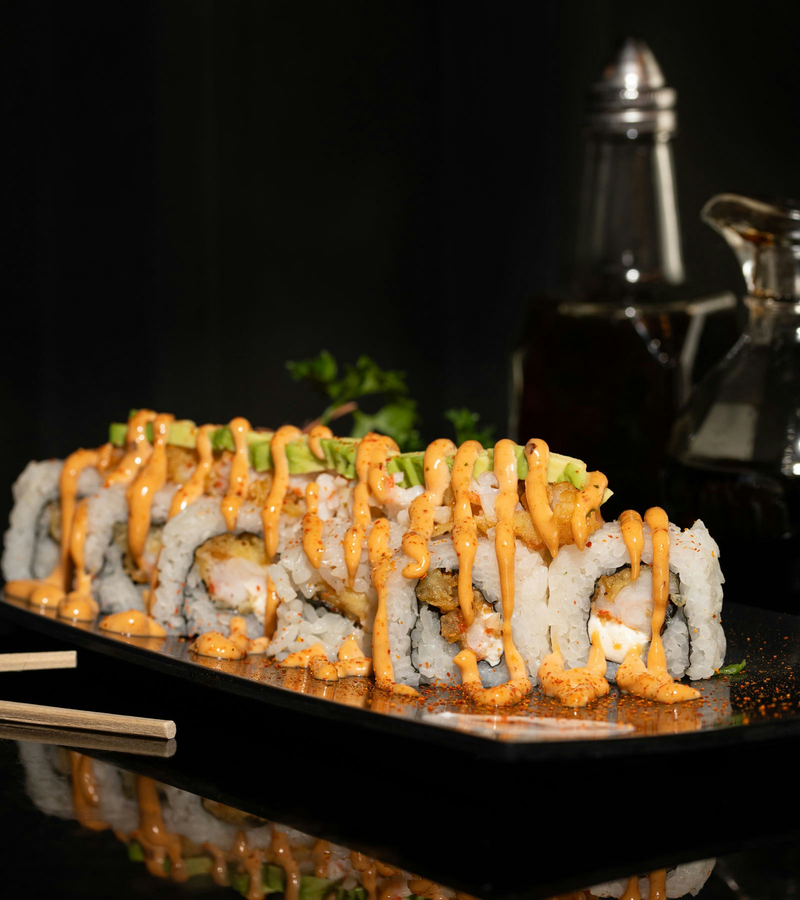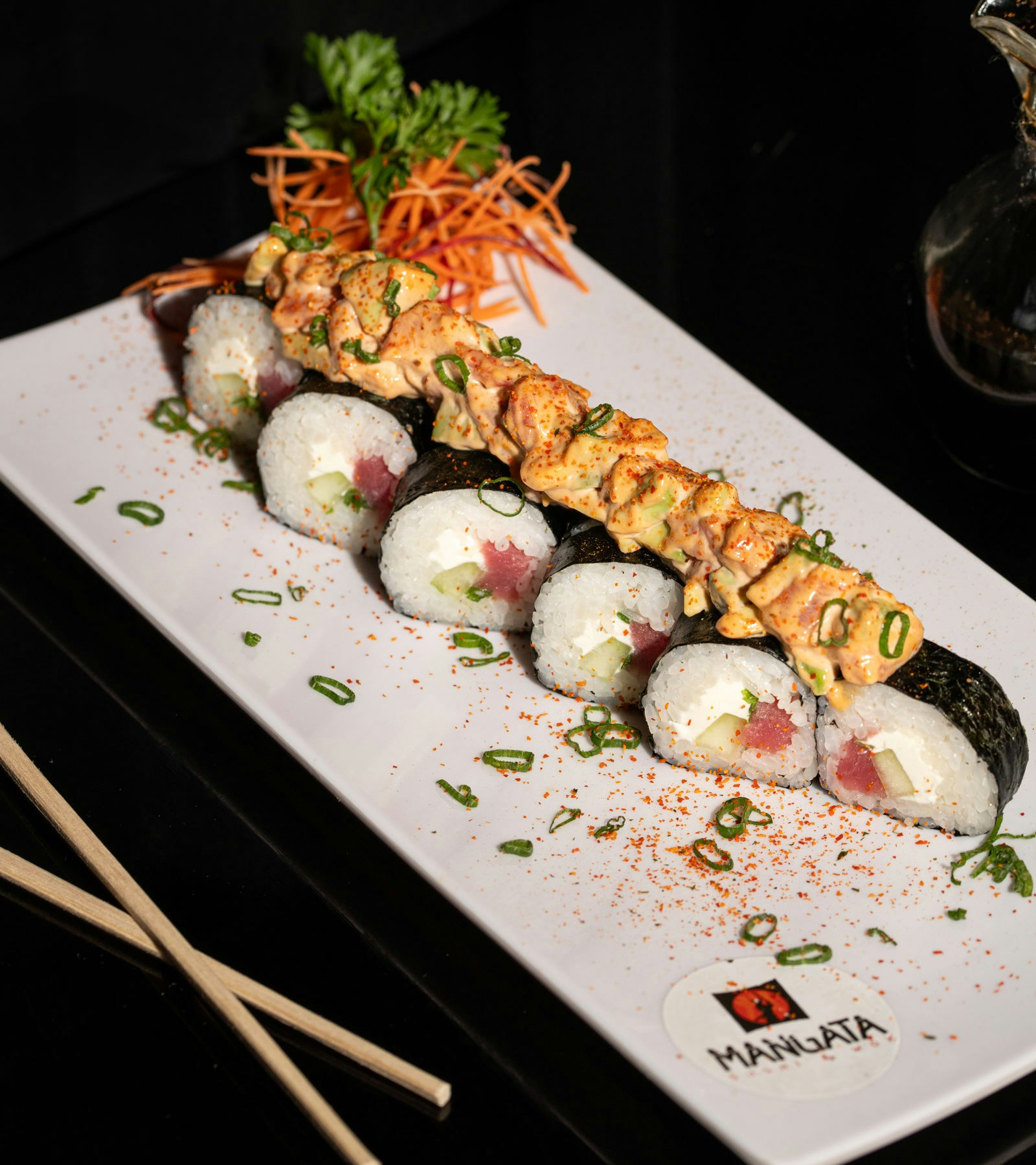 Mangata sushi y wok, servicio de sushis fríos y calientes, platillos de pollo, carne, mariscos, pastas y entradas.